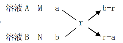 当浓度问题涉及到两种或者两种以上的溶液混合的时候,我们就可以采用十字交叉的方法来分析。假设溶液A、B的质量分别为M、N,浓度为a、b,混合后的浓度为r,则有Ma Nb=(M N)r,即M(r-a)=N(b-r),放入十字交叉模型有,