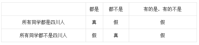 首先我们先来看看所有s都是p与所有s都不是p两者之间的规律。分别举例子为所有同学都是四川人与所有同学都不是四川人。通过以下表格所示: