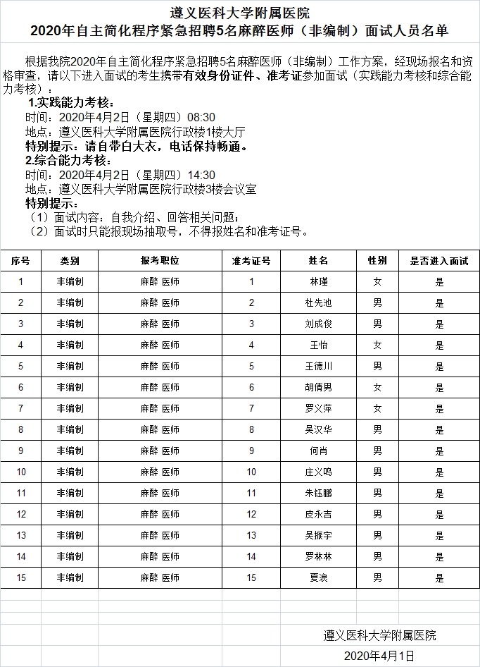 2020年遵义医科大学附属医院自主简化程序紧急招聘5名麻醉医师(非编制)面试人员名单