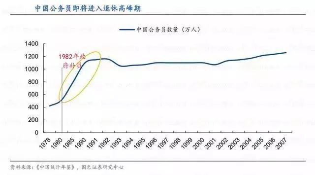 公务员到了一定年龄将会面临退休,据统计,从1980年到1990年十年的时间,公职人员的队伍有了翻倍的增长,这也就表明党政机关及机关事业单位内有一大批1961年以后出生的工作人员,2020年前后左右,1962年以后出生的人已经五十快六十岁了,距离退休也不远了,甚至可能将将迎来“退休潮”。