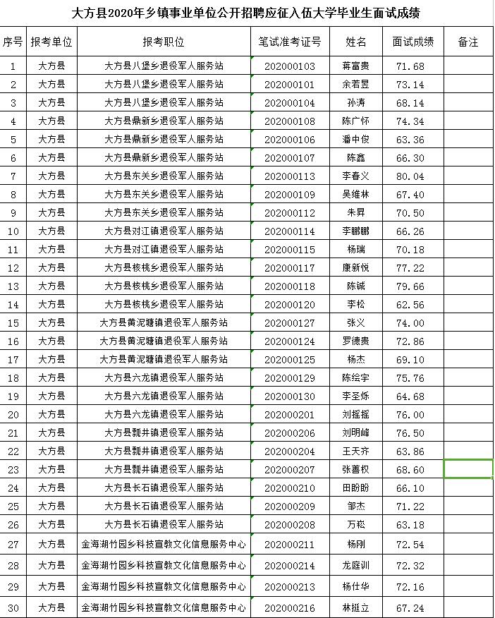大方县2020年乡镇事业单位公开招聘应征入伍大学毕业生面试成绩公示