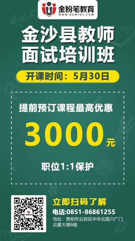 贵州教师招聘考试信息网提示:2021年贵州省毕节市金沙县教师招聘50名面试培训班哪个好?金沙县教师面试培训班哪个机构好?金沙县教师面试培训机构有哪些?金沙县教师面试培训有效果吗?金沙县教师面试培训班多少钱?金粉笔教育金沙县本地有教师培训班有吗?本班次主要针对金沙县2021年教师招聘面试培训,2021年金沙县教师招聘面试培训价格是多少呢?班次不同,费用不同,可以根据自身时间和情况进行培训班次选择。