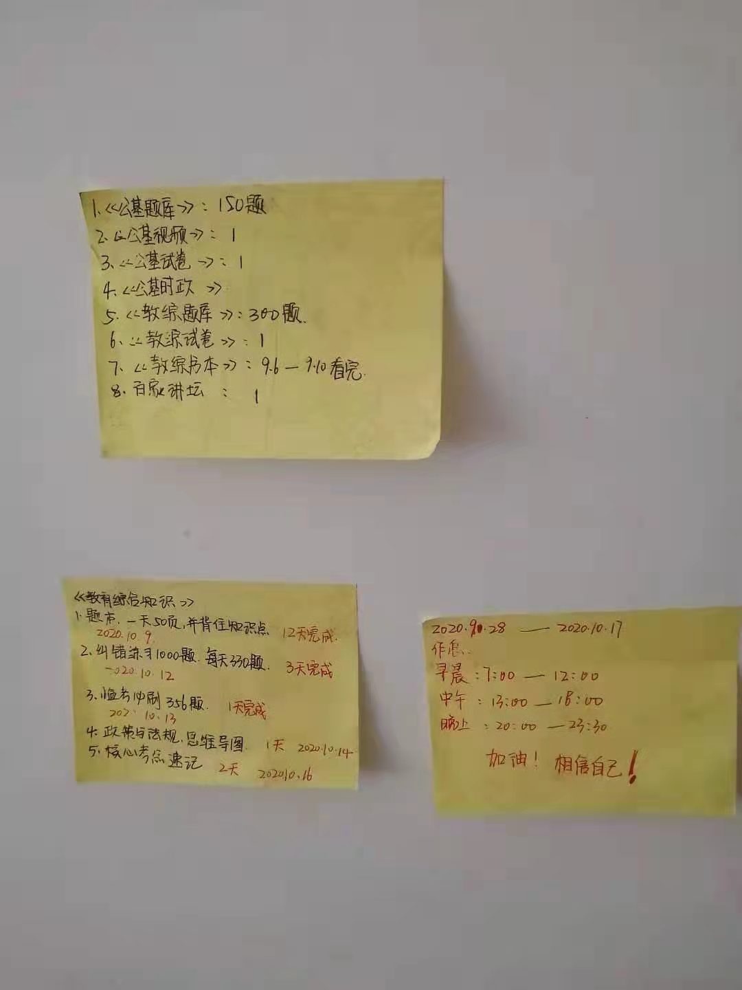 2020年同时考上两个地方的编制,仅用半个月的时间。在此之前考过很多次,无疑都无情的失败,在年底的最后招考最终上岸。第一,拟出一份计划表,并切实履行。第二,心中要有坚定的信念。要想着为什么成功上岸的是别人,而不是自己,总有人要成功,那个人也可能是自己。第三,找差距。在所有的备考资料书都准备差不多之后,疯狂刷题,看错题,对照错题再看教材,这往往就决定那几分进面试的成绩。