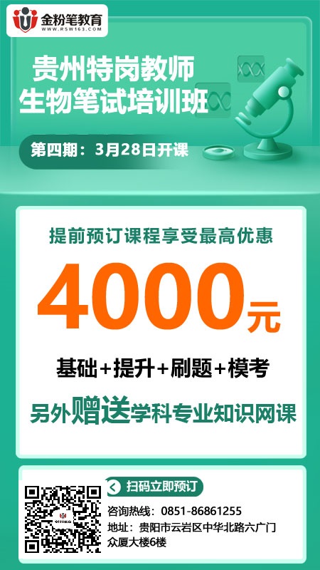 2022年贵州省特岗教师生物学科笔试如何进行备考?金粉笔教育针对2022年贵州省特岗教师生物学科考试,开设了特岗生物学科笔试线下课程和线上网课,双重学习更有效果。想要报考今年贵州特岗教师生物学科的考生,有大量复习时间的人员可以选择线下协议班学习,赠送生物学科网课,线上线下结合学习,提升学习效果;没有复习时间的人员可以选择单独购买生物学科网课学习,特岗教师生物学科培训详情咨询可添加微信:13368515037(王老师),13378508157(董老师)。