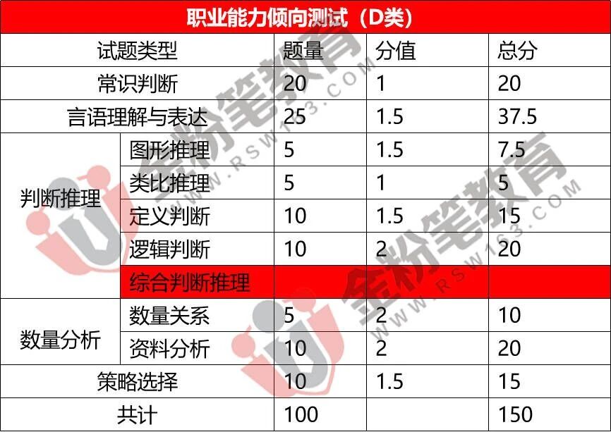 《职业能力倾向测验(D 类)》主要测查与中小学教师职业密切相关的、适合通过客观化纸笔测验方式进行考查的基本素质和能力要素,考试题型有常识判断、言语理解与表达、数量分析、判断推理、策略选择等部分。