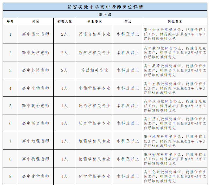 高中地理老师1人;高中物理老师1人;高中化学老师1人