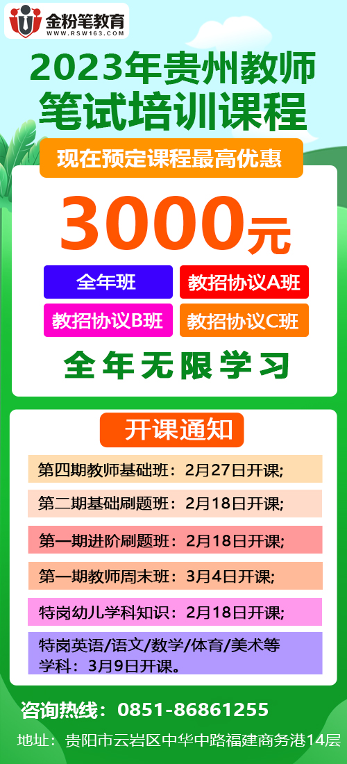 贵州金粉笔教育2023年特岗教师学科专业知识班3月9日开课,教育综合知识班2月27日,详情可以查看金粉笔教育。
