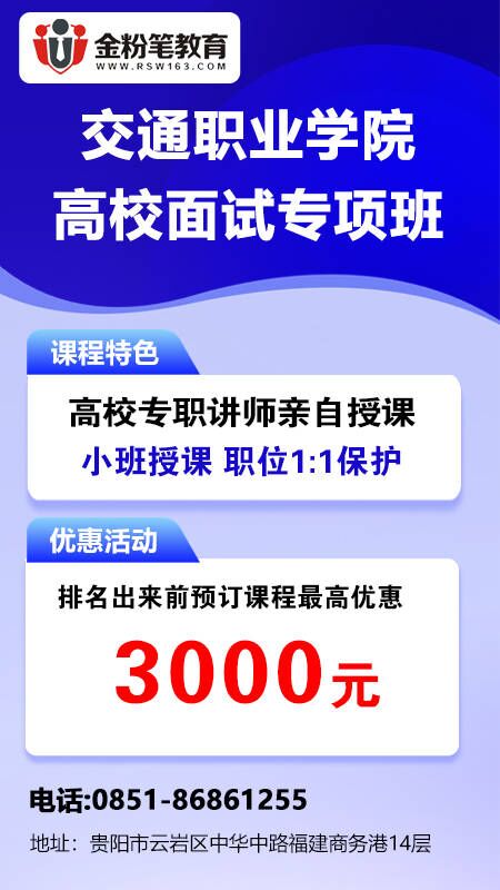 2023年贵州交通职业技术学院招聘面试班优惠来了,笔试排名公布前报班,最高可优惠3000元。金粉笔教育针对交通职业技术学院招聘面试,特开设高校面试专项班,小班授课,全程主讲老师带领,职位1:1保护,专项专将,讲练评测考相结合,能够更好提升考生面试能力,适应考场压力。面试课程详情咨询:13368515037(微信同号)。