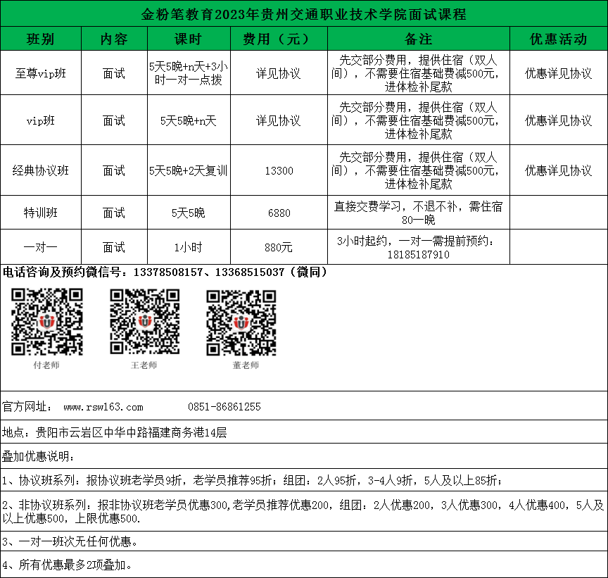 贵州交通职业技术学院招聘面试课程特点:高校面试专项班,小班授课,全程主讲老师带领,针对性强,讲练评测考相结合,更能提升考生面试水平。多种班次,满足不同面试人员的时间安排,课程具体费用及班次安排详情咨询:13368515037(微信同号)。