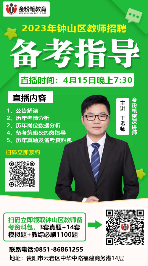 2023年六盘水钟山区事业单位教师类招聘350人,教师考试如何进行备考?锁定今晚(4月15日)7:30微信直播间,教综金牌教师老王和你一起来分享! 课程详情及直播咨询:13368515037(微同)