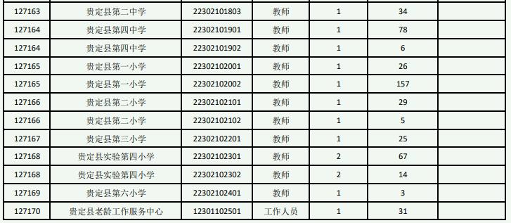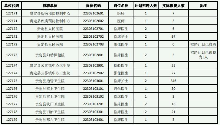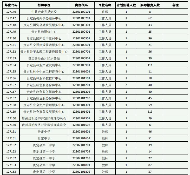 贵定县2023年统一面向社会公开招聘事业单位工作人员网上报名、缴费及计划调整已经结束,根据《贵定县2023年统一面向社会公开招聘事业单位工作人员简章》规定,现将各岗位报名人数(以实际缴费为准)进行公示(详见附件)。