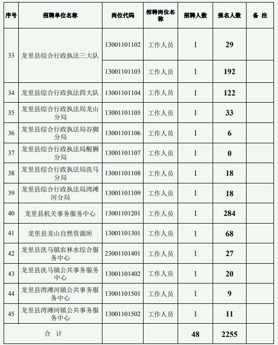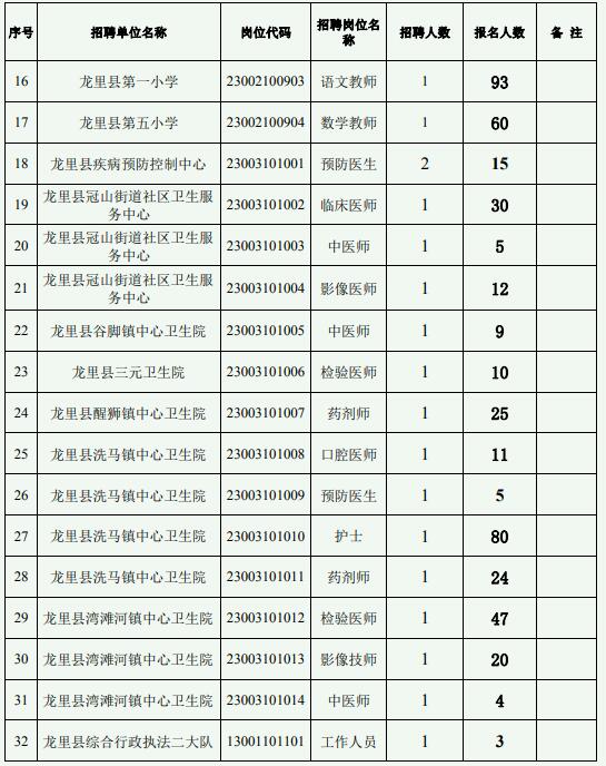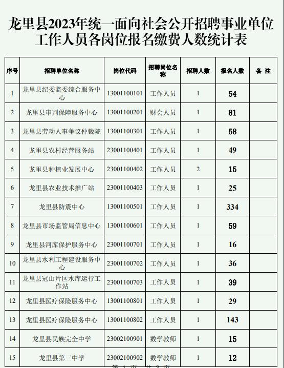 龙里县2023年统一面向社会公开招聘事业单位工作人员报名工作已结束,根据《龙里县2023年统一面向社会公开招聘事业单位工作人员简章》的规定,现将各岗位报名缴费人数予以公布。
