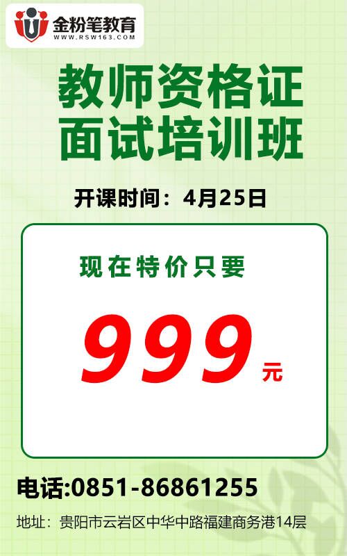 2023年上半年贵州教师资格面试考试时间5月13日-5月14日,贵州金粉笔教育2023年中小学教师资格考试面试培训课程优惠来了,教师资格面试班4月25日开课,课时4天4晚,只需999元。教资证面试班预定及课程详情咨询:13368515037(微同)