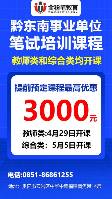 贵州金粉笔教育2023年黔东南州事业单位笔试培训课程优惠来了,黔东南州教师类笔试培训班4月29日开课,黔东南州综合岗笔试培训班5月5日开课,开课前预定课程最高可享受3000元优惠。课程详情及预定咨询:13368515037(微同)。