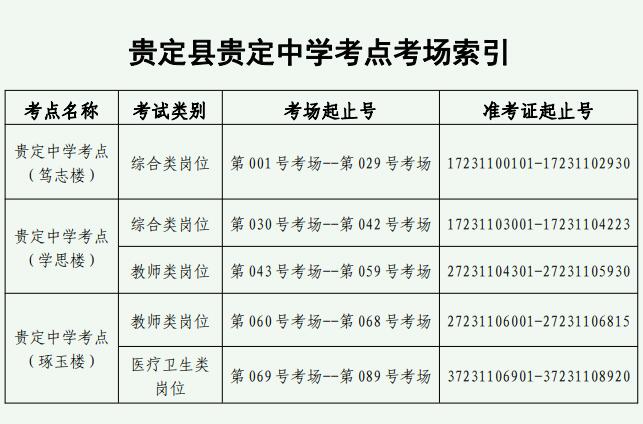 五、敬请广大考生注意,本次笔试考点设在贵定中学,位于贵定县城东兴北路(书香未来城对面),到达贵定县城的公共汽车客运站为贵定客车站;到达贵定县城的铁路交通站点有贵定北站(高铁站)、贵定站(普铁站)。贵定县站(高铁站)、贵定南站(普铁站)均在贵定县昌明镇,距贵定县城所在考点位置约30公里,请考生结合实际安排好往返出行。