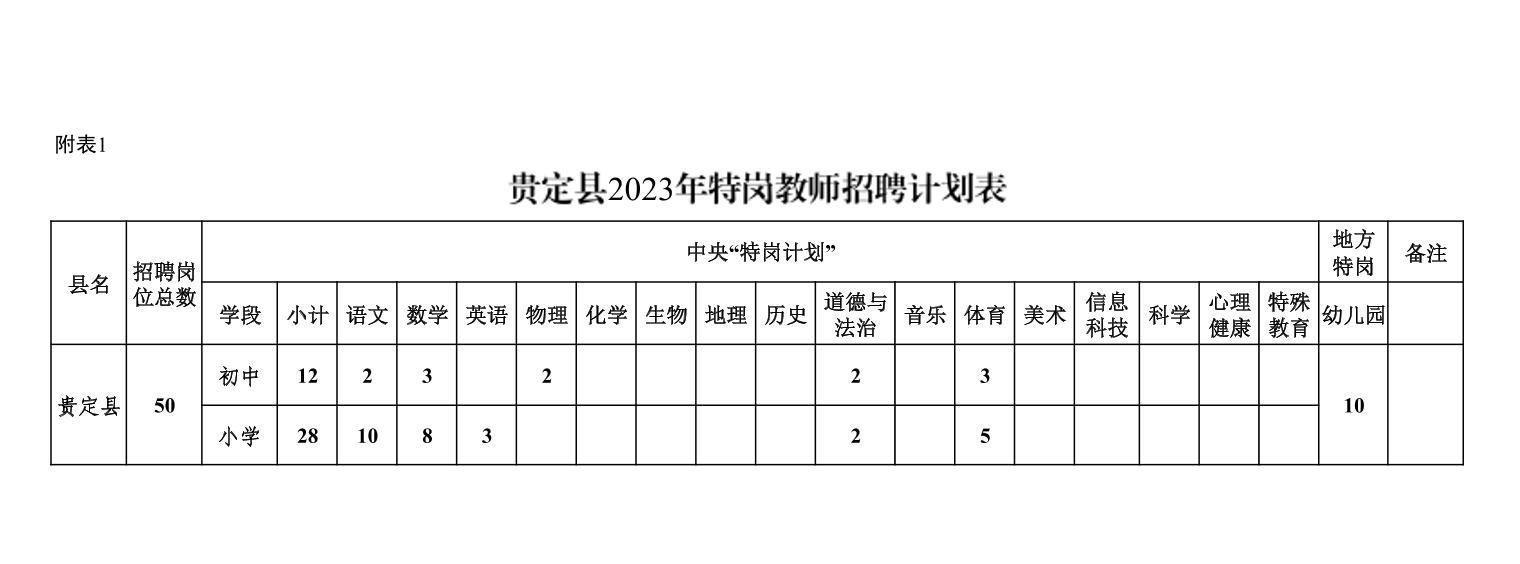 2023年贵定县计划招聘“特岗计划”教师50名。其中,中央“特岗计划”招聘40名,用于招聘农村初中、小学教师;地方“特岗计划”招聘10名,用于招聘农村幼儿园教师。具体分学科岗位招聘计划详见《贵定县2023年特岗教师招聘计划表》(附表1)。
