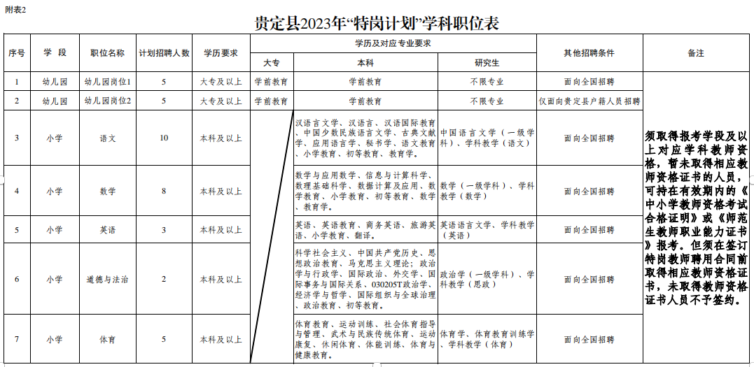 (二)招聘岗位学历、专业要求:初中阶段教师岗位要求本科及以上学历,以师范类专业为主;小学阶段教师岗位要求本科及以上学历,以师范类专业为主;学前阶段教师岗位要求大专及以上学历。具体招聘岗位学历、专业等要求,详见《贵定县2023年“特岗计划”学科职位表》(附表2)。