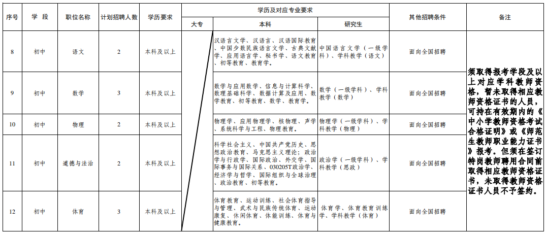 (四)重点为农村学校补充特岗教师,持续优化教师队伍结构,进一步加强道德与法治、体育与健康、外语、科学、劳动、艺术、信息科技、心理健康、特殊教育等紧缺薄弱学科教师的补充。