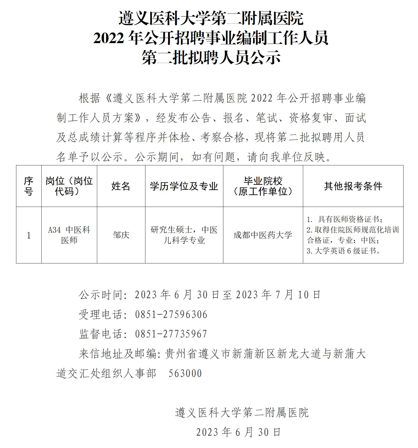 遵义医科大学第二附属医院 2022年公开招聘事业编制工作人员 第二批拟聘人员公示