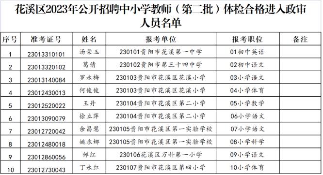 花溪区2023年招聘中小学教师(第二批)体检合格进入政审人员名单公告