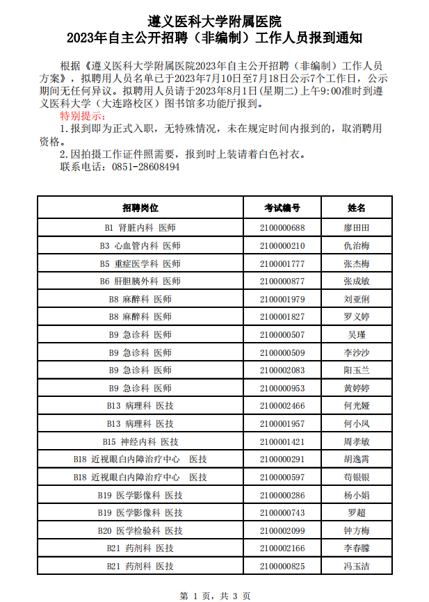 遵义医科大学附属医院2023年自主公开招聘(非编制)工作人员报到通知