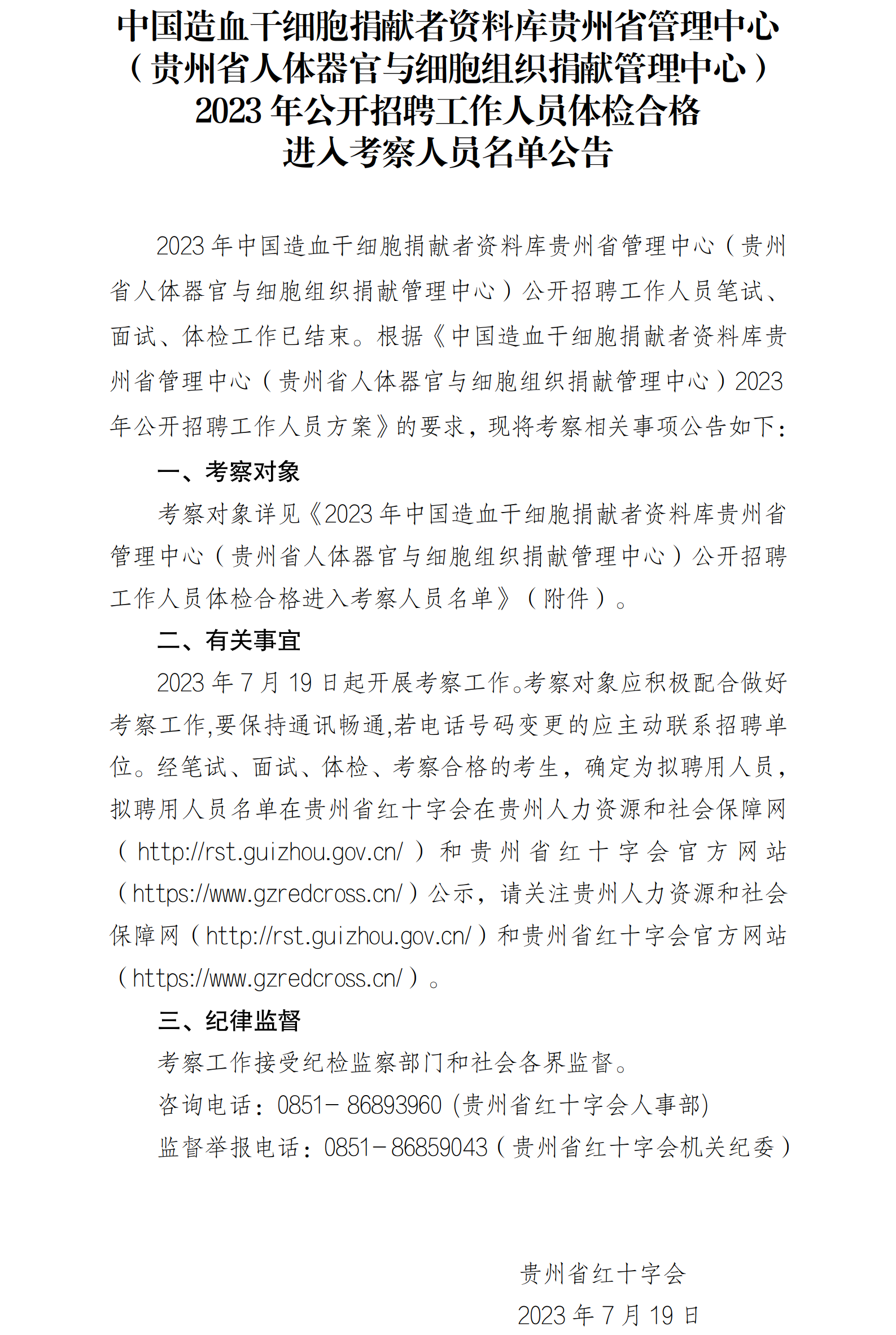 中国造血干细胞捐献者资料库贵州省管理中心(贵州省人体器官与细胞组织捐献管理中心)2023年公开招聘工作人员体检合格 进入考察人员名单公告