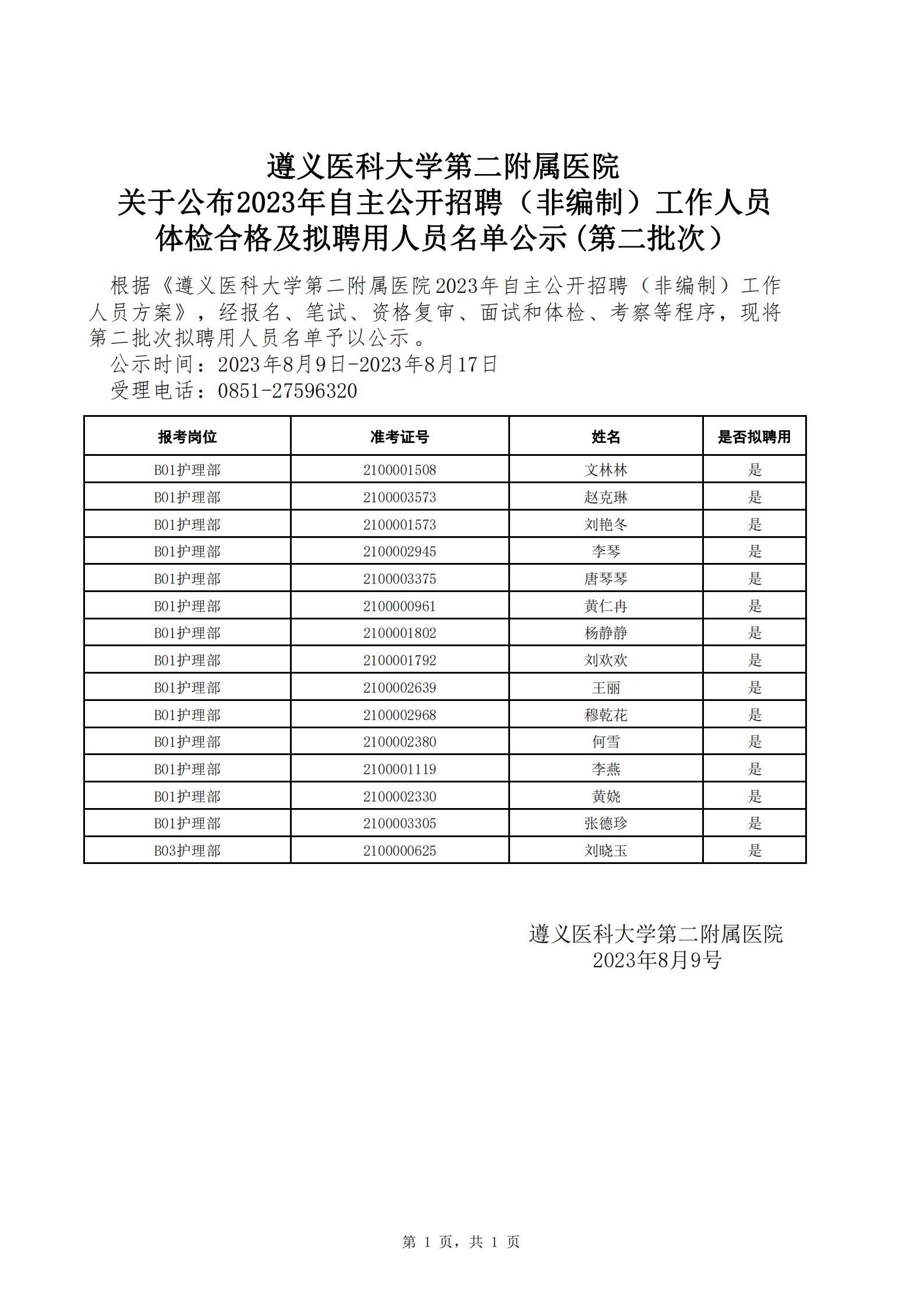 遵义医科大学第二附属医院2023年自主招聘(非编制)工作人员体检合格及拟聘用人员名单公示(第二批次)
