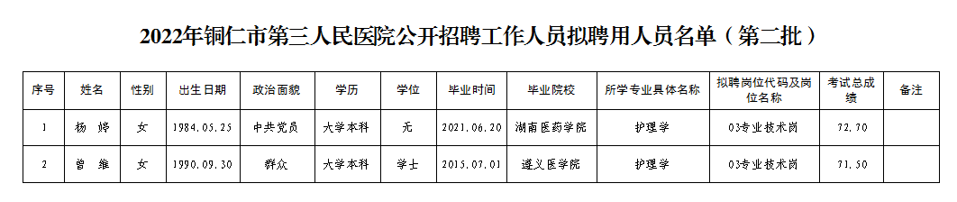 根据《铜仁市第三人民医院2022年公开招聘工作人员简章》规定,经过笔试、面试、体检和考察等程序,现将杨婷、曾维拟聘用人员进行公示(第二批?2人),具体人员名单附后。