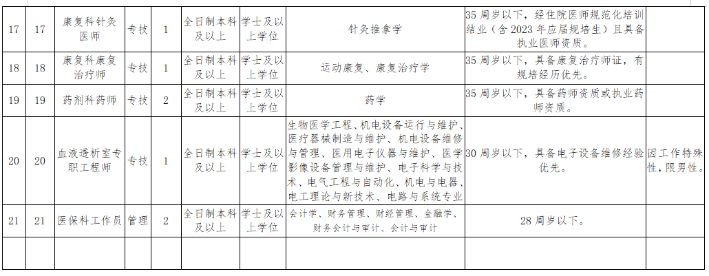 4.医师、医技岗位年龄在35周岁以下(1988年8月19日之后出生的);血液透析室专职工程师岗位年龄在30周岁以下(1993年8月19日之后出生的);医保科工作员年龄在28周岁以下(1995年8月19日之后出生的);