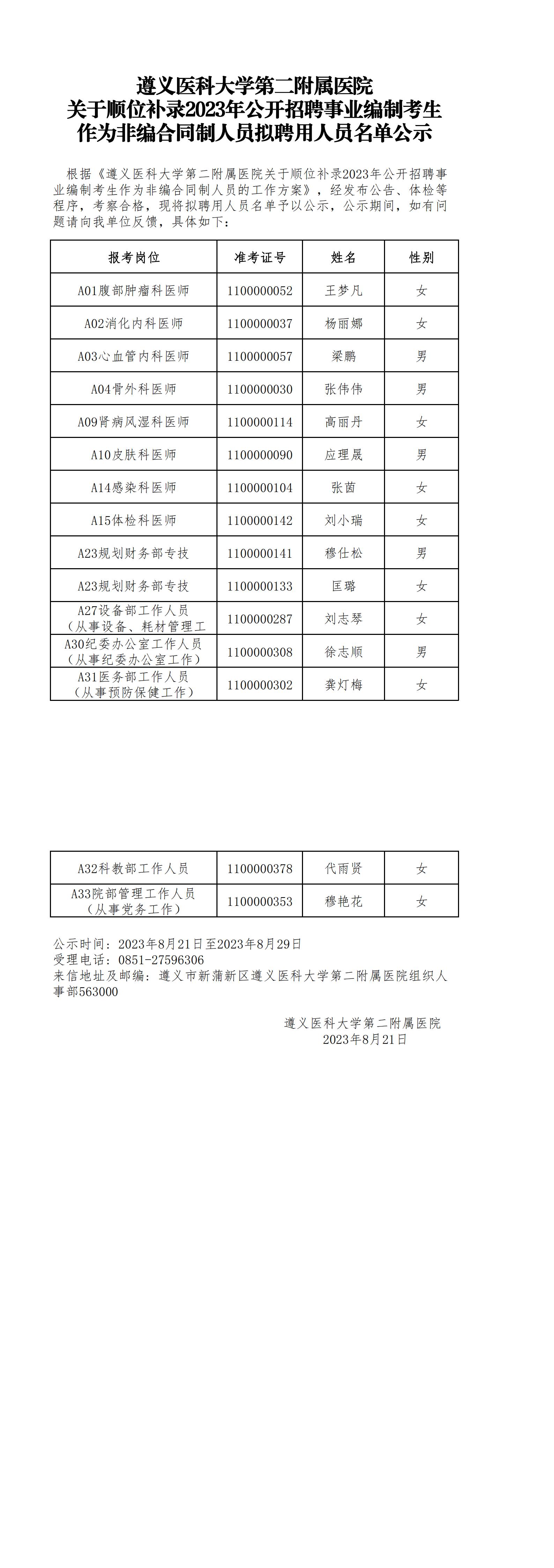 遵义医科大学第二附属医院关于顺位补录2023年公开招聘事业编制考生作为非编合同制人员拟聘用人员名单公示