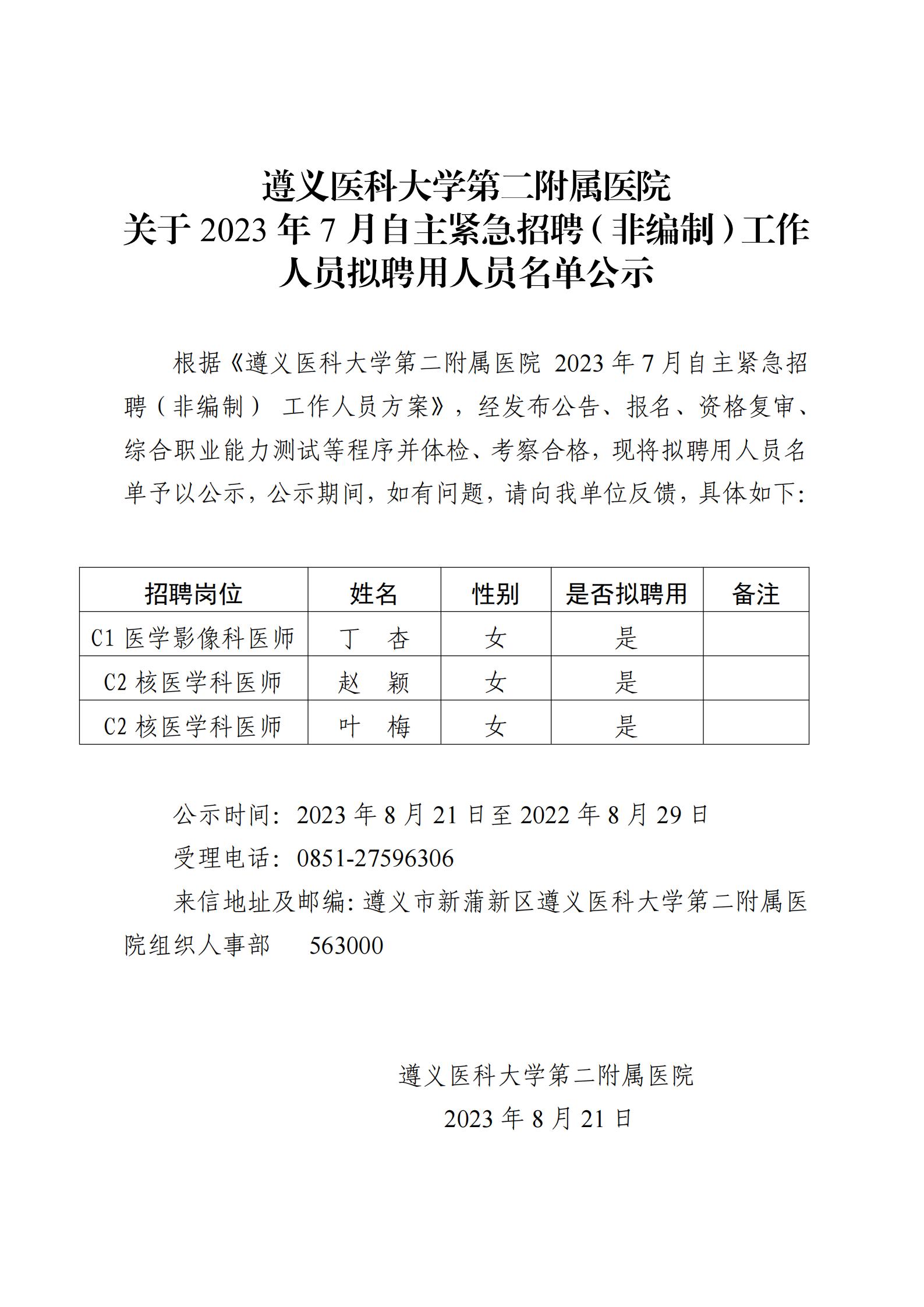 遵义医科大学第二附属医院 关于2023年7月自主紧急招聘(非编制)工作人员拟聘用人员名单公示