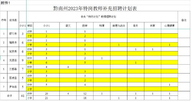 2023年黔南州“特岗计划”补充招聘41名,其中初中语文4名、初中数学12名、初中物理1名、初中音乐1名、初中体育1名、初中心理健康1名、小学数学18名、小学道德与法治1名、小学音乐1名、小学心理健康1名。各设岗县(市)具体分学科岗位招聘计划详见《黔南州2023年特岗教师补充招聘计划表》(附件1)。