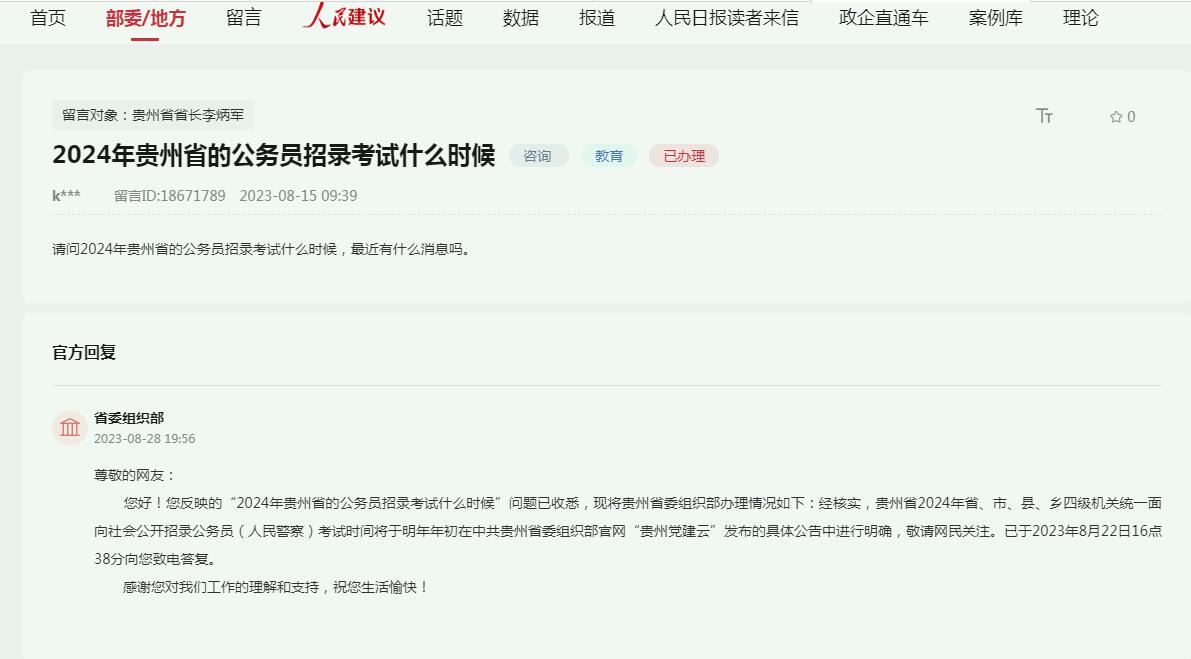 近期,在人民网-领导留言板贵州区上,有关注贵州省考的网友留言:请问2024年贵州省的公务员招录考试什么时候,最近有什么消息吗?领导留言板上官方回复:尊敬的网友: 您好!您反映的“2024年贵州省的公务员招录考试什么时候”问题已收悉,现将贵州省委组织部办理情况如下:经核实,贵州省2024年省、市、县、乡四级机关统一面向社会公开招录公务员(人民警察)考试时间将于明年年初在中共贵州省委组织部官网“贵州党建云”发布的具体公告中进行明确,敬请网民关注。