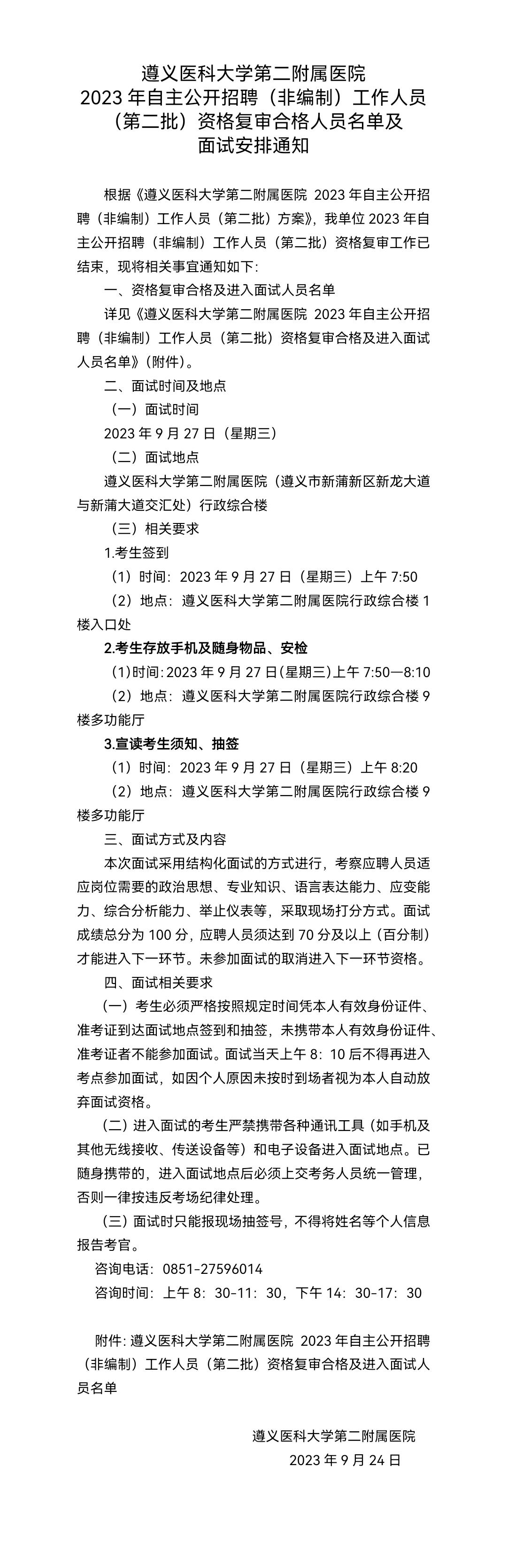 遵义医科大学第二附属医院 2023年自主公开招聘(非编制)工作人员 (第二批)资格复审合格人员名单及 面试安排通知