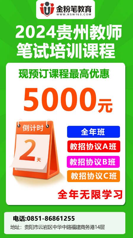 贵州金粉笔教育2024年贵州教招笔试培训课程优惠5000元活动截止2023年10月7日24:00结束,2024年贵州教师教招第一阶段最大优惠倒计时2天,有计划备考2024年贵州教招考试考生不容错过,早一点进入备考,早一点享受最大优惠,既可以按照计划进行学习,又可以最大程度节约成本。