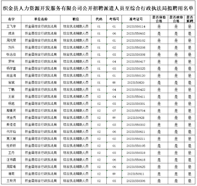 根据《织金县人力资源开发服务有限公司面向社会公开招聘23名派遣人员至织金县综合行政执法局工作的公告》,经过报名、笔试、面试、资格审查、体检、政审等程序,现对拟聘人员(名单见附件1)予以公示。