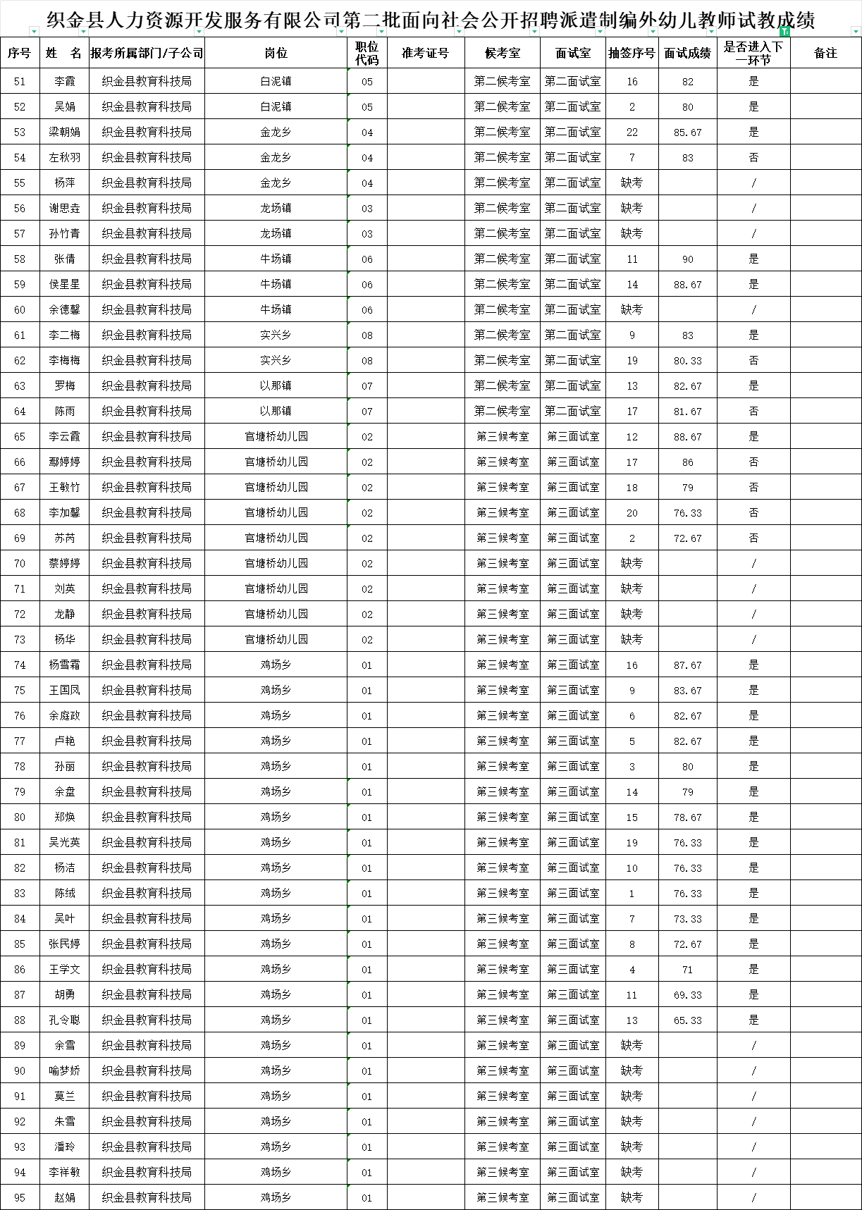 附件:织金县人力资源开发服务有限公司第二批面向社会公开招聘派遣制编外幼儿教师试教成绩