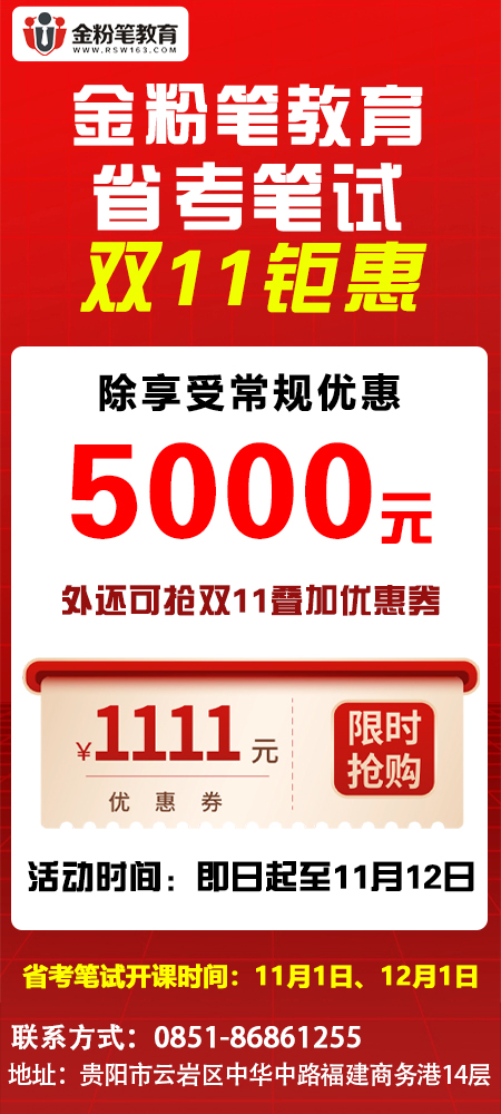 贵州金粉笔教育2024年省考笔试双11钜惠来了,截止2023年11月12日,预定或报2024年省考笔试班,省考协议班除了最高可享5000元,还可以抢双11优惠劵(1111元),2024省考笔试开课时间:11月1日、12月1日,2024年省考课程设有省事一体协议班、省考协议班、省考集训班等,多种班次,可以根据自身情况选择对应的班次进行报名,超长课时,从基础到冲刺,逐步提升。双11期间报班,优惠更实惠,全年仅此一次。报班或课程咨询:13368515037(微同)。