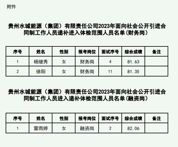 我公司在2023年9月25日公布体检人员名单,财务部门有1人因个人原因放弃进入体检资格,1人因档案问题无法进行政审;融资部1人因档案问题无法进行政审。根据《贵州水城能源(集团)有限责任公司2023年面向社会公开引进合同制工作人员公告》相关公告,现将递补体检人员名单进行公布。