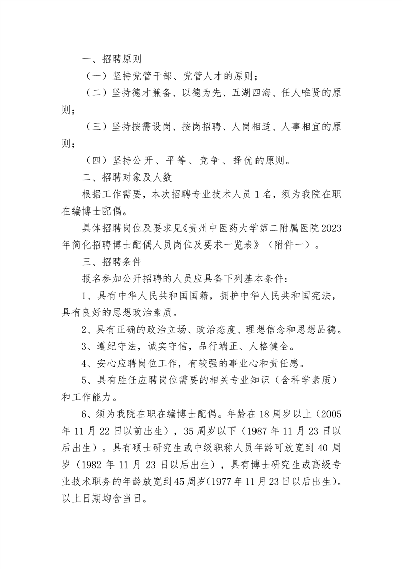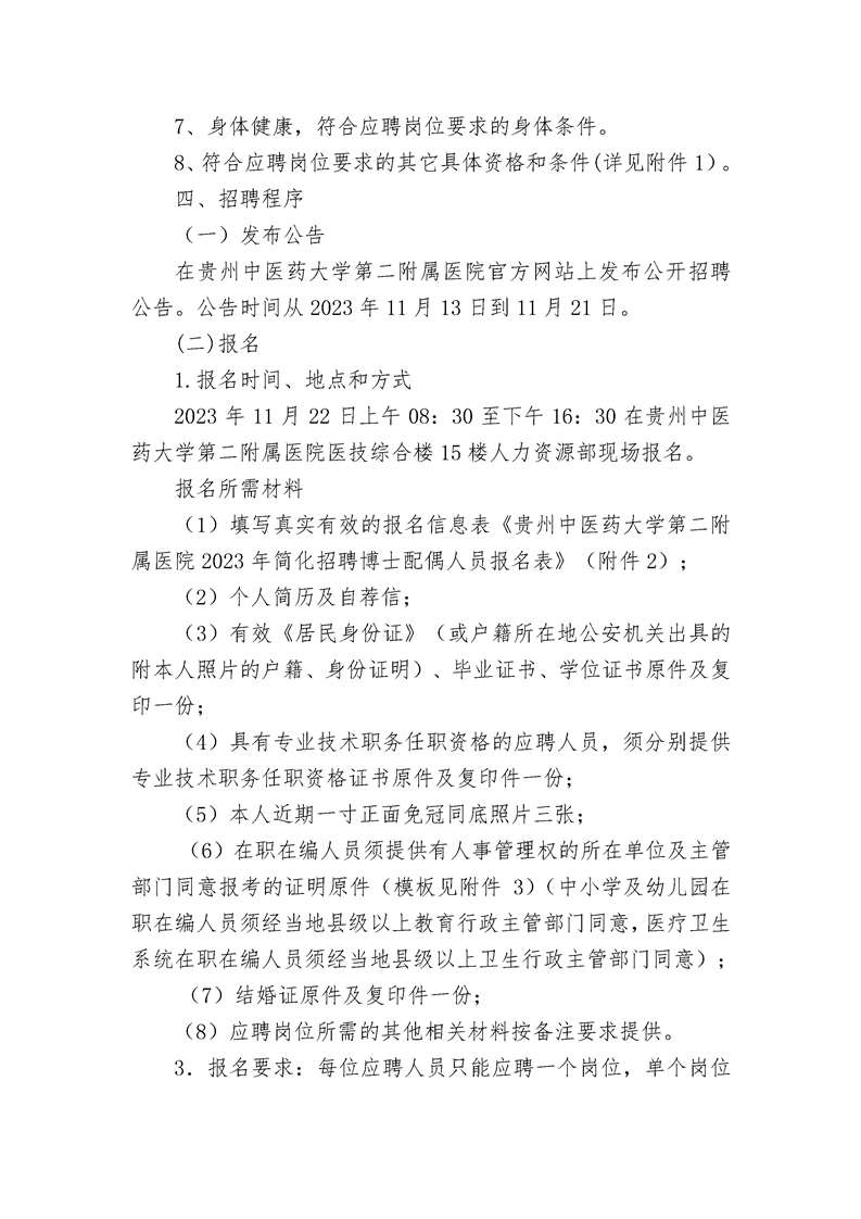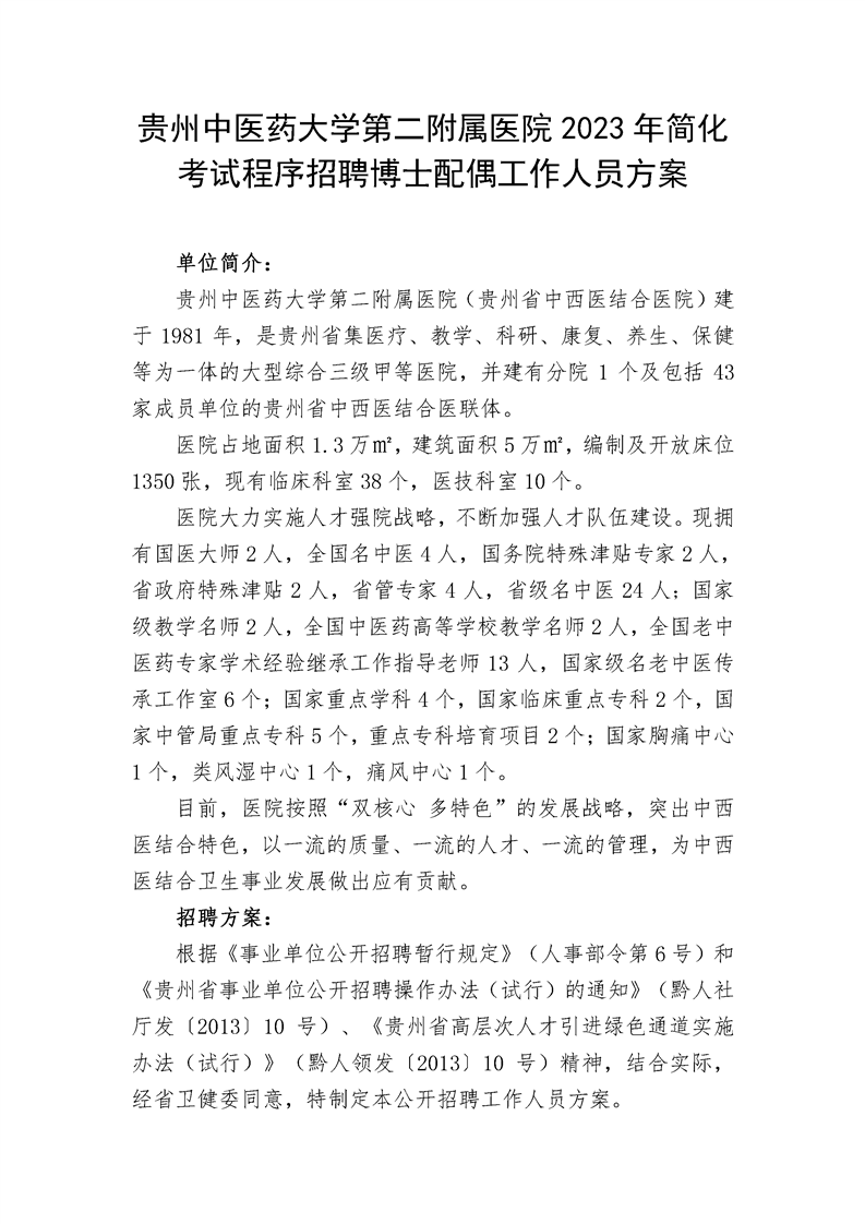 贵州中医药大学第二附属医院2023年简化考试程序招聘博士配偶工作人员方案(1名|11.22报名)