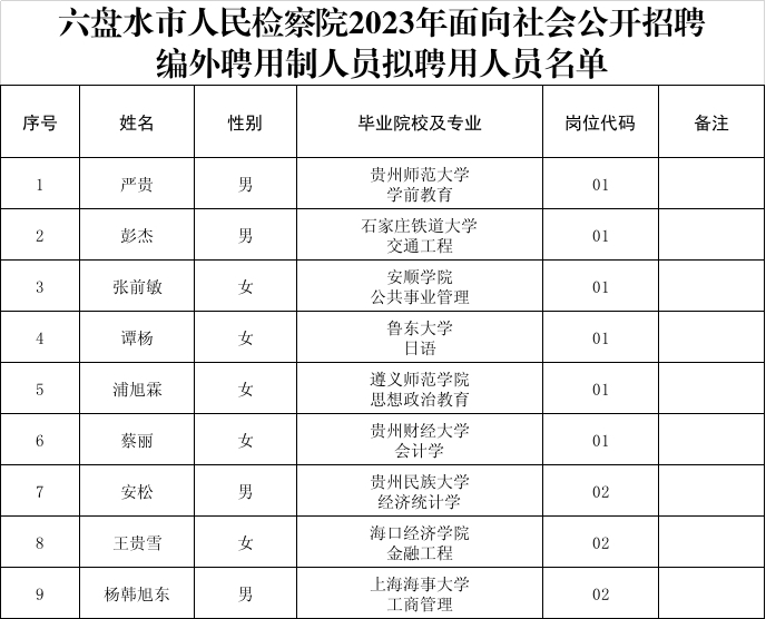 六盘水市人民检察院2023年面向社会公开招聘编外聘用制人员笔试、面试、体检、考察等工作已完成。根据有关工作要求,现对六盘水市人民检察院2023年面向社会公开招聘编外聘用制人员拟聘用人员进行公示: