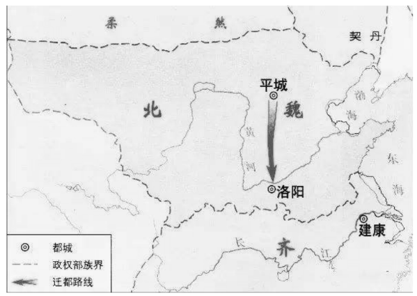 根据图片内容可知北魏政权将都城由平城迁往了洛阳,所以该历史事件是北魏孝文帝改革。其主要内容是汉化运动,包括推行均田制和户调制,变革官制和律令,迁都洛阳,改易汉俗等