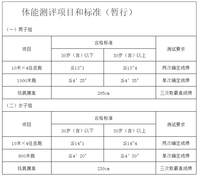 纵跳摸高项目测评不超过3次。10米×4往返跑项目在测评前可进行一次试测,但不计成绩;测评次数不超过2次,考生有一次测评达标的,即视为该项目测评合格。