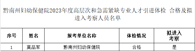 根据《黔南州妇幼保健院2023年度高层次和急需紧缺专业人才引进方案》以及《黔南州妇幼保健院2023年度高层次和急需紧缺专业人才引进面试工作方案》的有关规定,黔南州妇幼保健院2023年度高层次和急需紧缺专业人才引进经过面试、体检工作。现将体检合格及拟进入考察人员名单进行公示(详见附件),如有异议,请在公示期内向黔南州妇幼保健院2023年度高层次和急需紧缺专业人才引进工作领导小组反映,逾期不予受理。公示期从发布公示当日起,为期七天。
