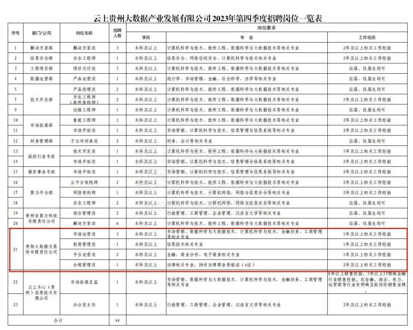详见附件《云上贵州大数据产业发展有限公司2023年第四季度招聘岗位一览表》。