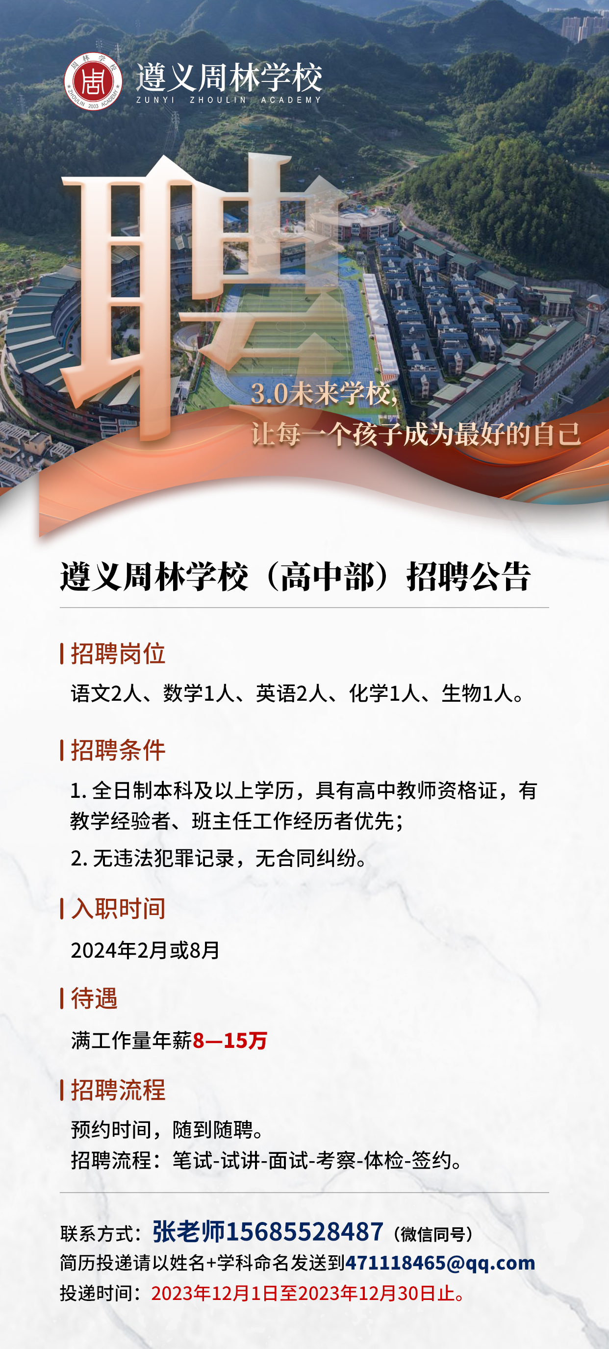 遵义周林学校(高中部)教师招聘公告(7名|12.1-12.30报名)