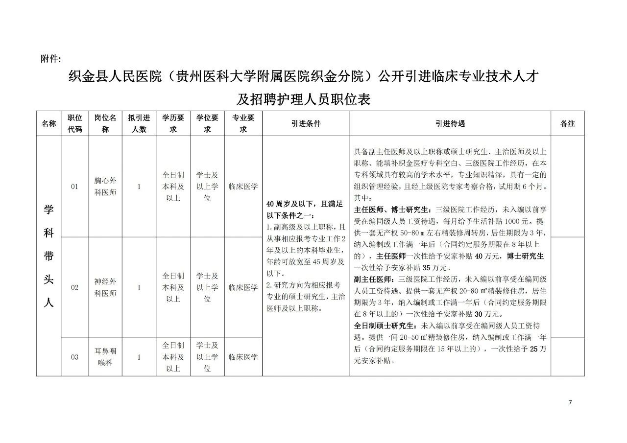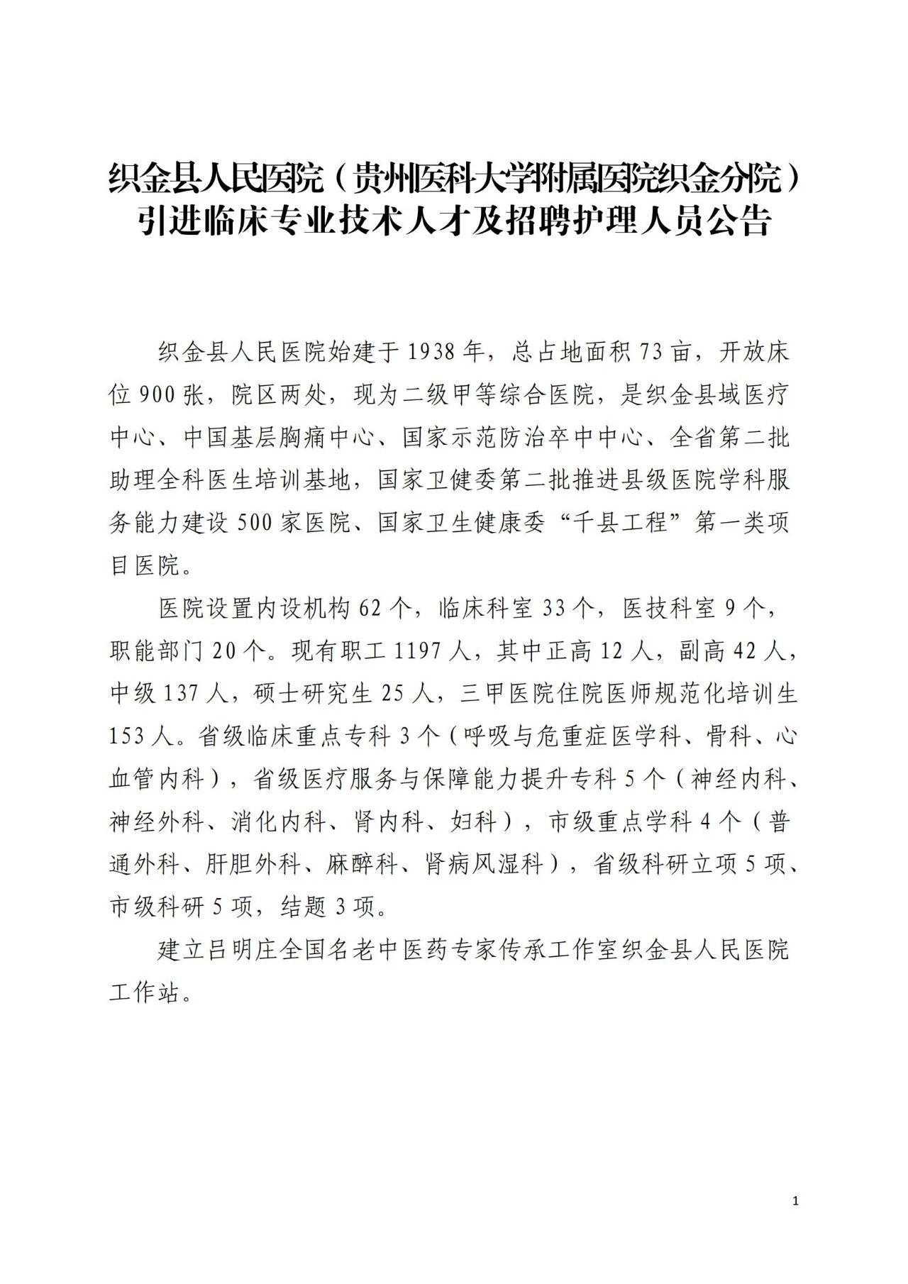 织金县人民医院(贵州医科大学附属医院织金分院)引进临床专业技术人才及招聘护理人员公告