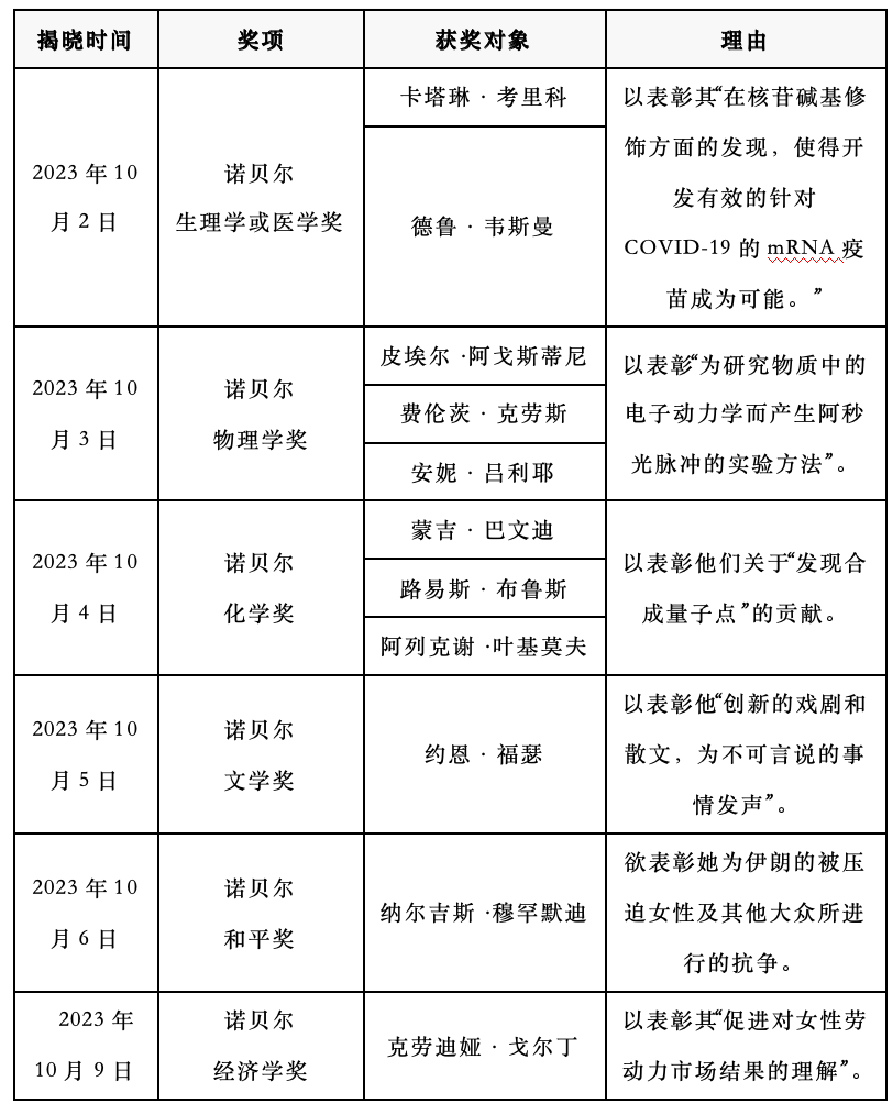 以下为2023年诺贝尔奖各奖项获奖情况:
