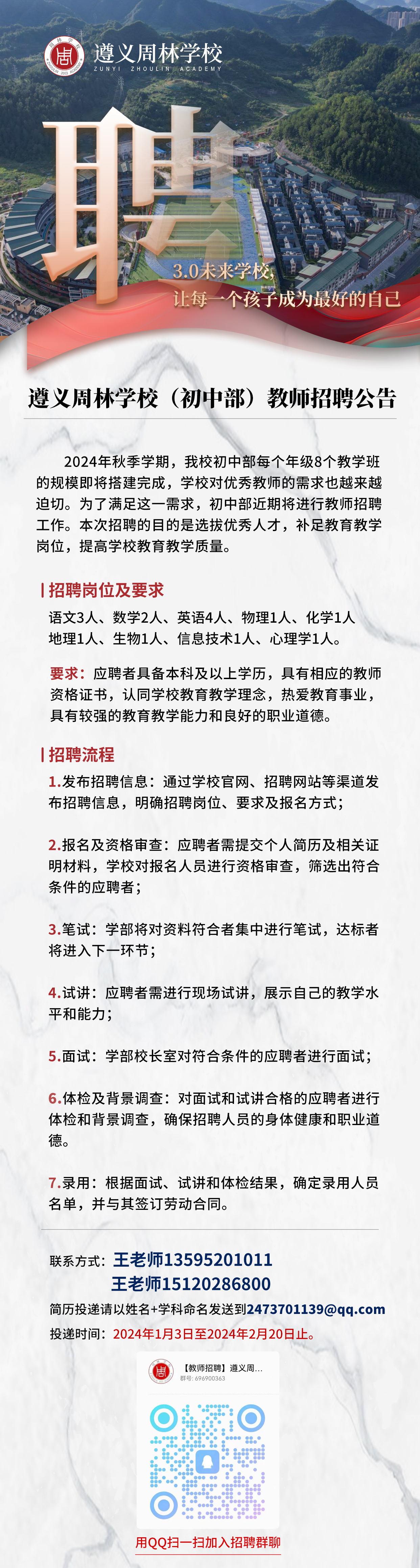 遵义周林学校(初中部)教师招聘公告(15名|1.3-2.20报名)