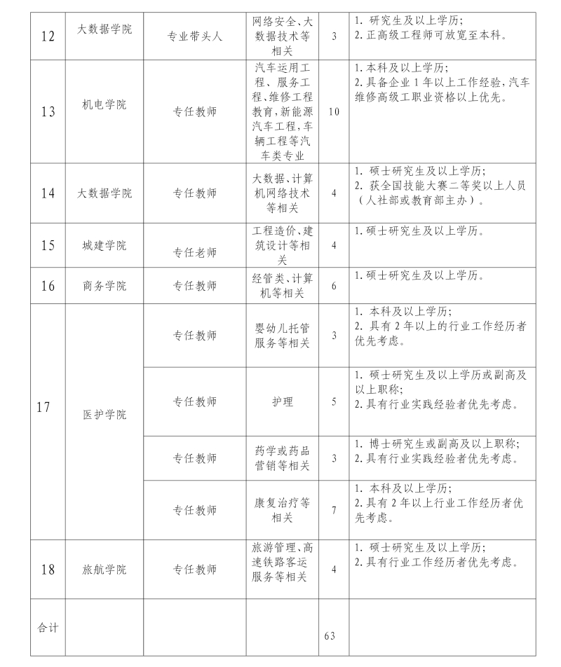 2024-01-08 09:32|来源:金粉笔教育|热度:手机上打开 贵州城市职业学院是2001年经省政府批准成立,教育部备案纳入国家计划内统一招生录取的贵州省第一所民办全日制普通高校。学校秉承“求慧至真、笃行超越”的校训,坚持“立足贵州,面向全国,服务区域经济社会发展、产业结构调整和城镇化建设,培养面向生产、建设、管理、服务一线具有社会责任感和创新精神,应用能力强的高素质应用型人才”的办学定位。我校现面向社会招聘,期待优秀的您的到来。1.坚持德才兼备的原则,对德行品行有问题者实行一票否决;5.具有企业工作经历者、高级职称同等条件下优先录用;二、招聘岗位及要求